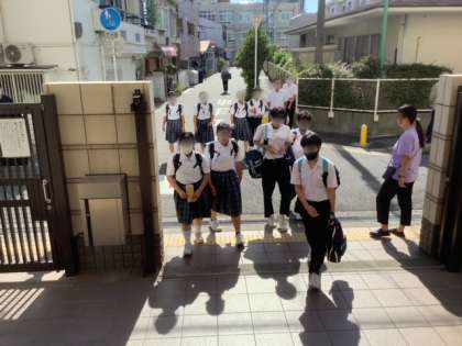 今朝もよく晴れて少し暑い中、元気よく登校しています。本日は2年の学年集会の日なので、2年生は早めに登校しています。