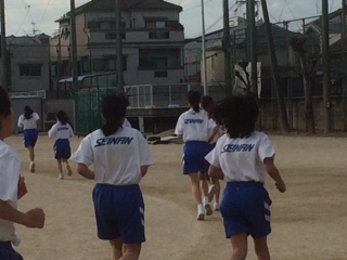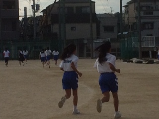 リズミカルな曲に合わせて、20分間走ります。誰ひとり、足を止める生徒はなく、「スタスタ・・・」をこぎみよい足音と息遣いが聞こえました。体力アップと精神力のアップですね。