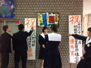 今年度、第2弾!先日表彰があった「納税貯蓄組合大阪府連合会優秀賞」「軟式野球部7ブロック優勝」の立て看板づくりを生徒会が呼びかけたところ、各学年から複数名の応募がありました。今回は2年生にお願いをして、書いてもらいました。