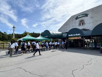 昼食場所『牧歌の里』に到着しました。お腹ペコペコ…今からBBQです〜!