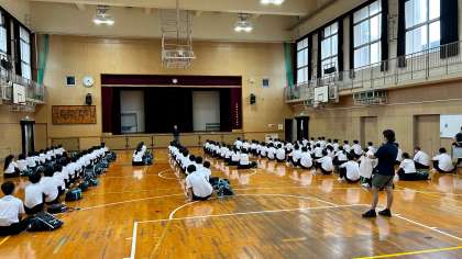 楽しい修学旅行を終え、今日は体育館で集会をしています。