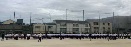 校長先生からは「先日の3年生の修学旅行では、ふだん味わえない体験ができ、大阪では見ることができない満点の星空も見ることができました。3年生のみなさんは、初めてのこと・困ったことなどに対して、時には班やクラスの枠を超えて助け合ったり、声を掛け合ったりすることができました。助け合いとともに、競い合うことも大事にしてください。自分の目標をもう一度確認して、テストだけでなく、いろいろなことで身近な人と競い合い、お互いを高め合ってください。」というお話がありました。