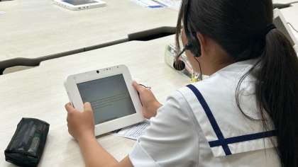真剣な表情で静かにタブレットを見つめていると思ったら、一斉に英語で話し始めるのを見て、しっかり聞き取って理解しているんだなと感じました。