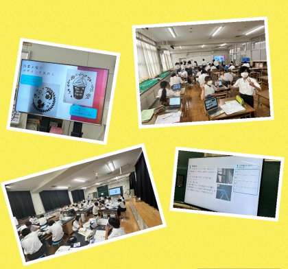 1年生の授業の様子です。理科ではグループ学習でみんなで考えています。美術はガラス工芸(サンドブラスト)のデザインを考えています。