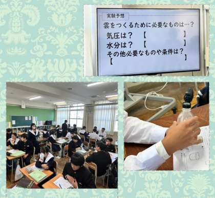 今日は朝から肌寒さが感じられる1日でしたが、生徒たちは意欲的に授業に取り組んでいます。2年生理科では、雲を作る実験をしています。