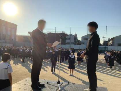 お話の後は、大阪市中学校総合文化祭(科学理科の部)の自由研究と、3年生の「税に関する標語」の表彰がありました。