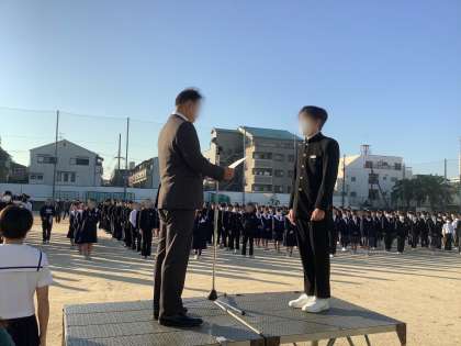 校長先生からは「今日から期末テストの答案が返却されますが、点数が良かった悪かったといった感想だけではなく、結果に目を向けてください。悪かった人がなぜできなかったのか、テストに取り組む姿勢に反省点がなかったのかを考えてください。良かった人もどうすればさらに良くなるのか考えてみてください。3年生は校長面接指導が始まります。学力面だけでなく、自分がどういう姿をもって入試に挑んでいるのかが試されます。1・2年生もまだまだ先のこととは思わずに、今のうちにできることをしっかりとやっておきましょう」というお話がありました。