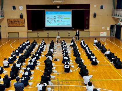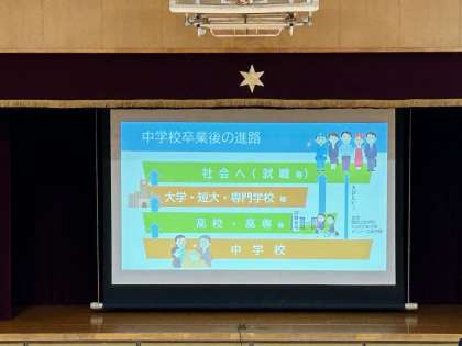 2年生は5時間目に体育館で進路指導担当の先生から説明を聞きながら、進路について学習しました。