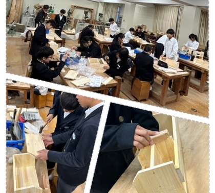 技術の授業でラックを作っています。釘打ちやヤスリかけといった作業を根気強く丁寧に繰り返しながら、何人かの生徒は完成に近づいています。