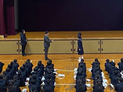 始業式の中で、校長先生からのお話とバレーボール部の賞状伝達を行いました。短い3学期ですが、今後ともよろしくお願いいたします。