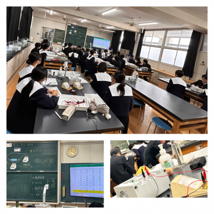 英語では隣同士で英文を声に出して読んでいます。理科は理科室で実験器具を使って電流の学習をしています。