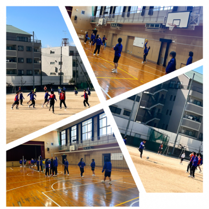 男子の体育は厳しい寒さの中でも元気にサッカーをしています。