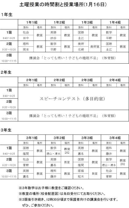 予定は、以下の通りです。なお、3年3組の1限の授業は、音楽から英語に変更になりました。ご注意ください。