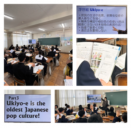 2年生の英語の授業の様子です。日本の伝統文化の一つである「浮世絵」が海外に与えた影響などが題材となっています。見たことある浮世絵にはたくさん手が挙がっていました。