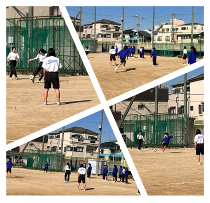 体育の授業の様子です。男女に分かれてキックベースボールをしています。力強いキックやファインプレーも見られました!!