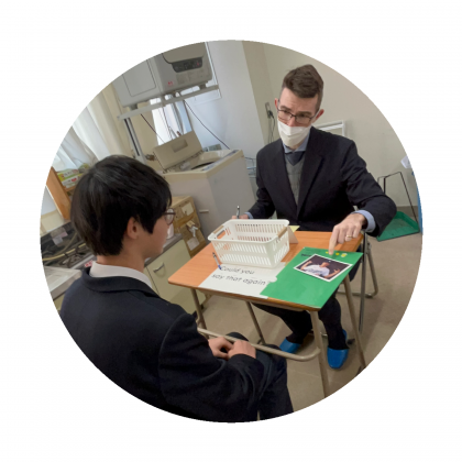 英語の授業でC-NETの先生から英語でインタビューを受けています。少し考えながら、しっかりと英語で答えていました。