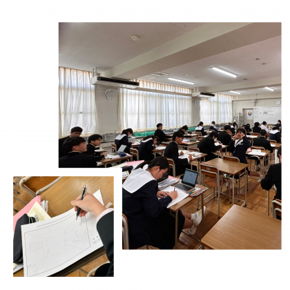 美術の授業の様子です。マイルームをデザインしています。細かい部分の色塗りを丁寧にしている様子も見られます。中にはデザインに行き詰っている人も・・・