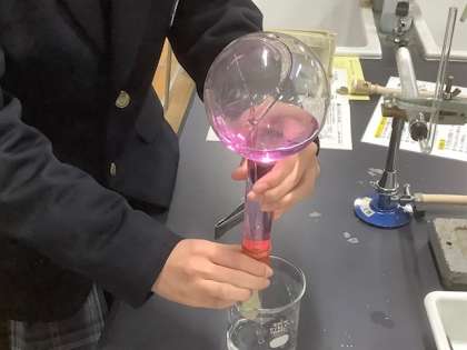 アンモニアを集めた丸底フラスコに、スポイトで少量の水を入れるとビーカーの水が吸いあがり、フラスコ内に赤い噴水ができました。