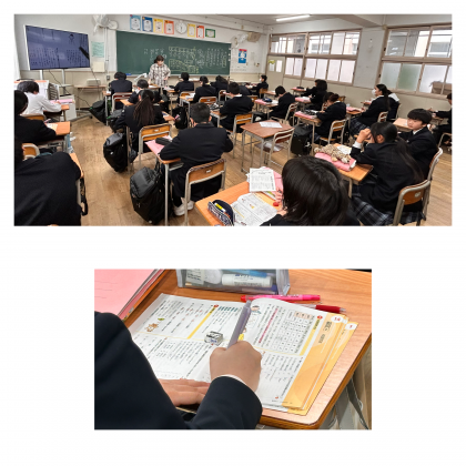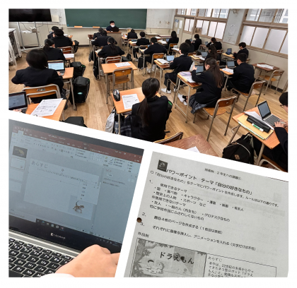 技術と国語の様子です。 技術の授業では、自分の好きなものをタブレットを使って検索、情報収集し、パワーポイントを使って作成しています。