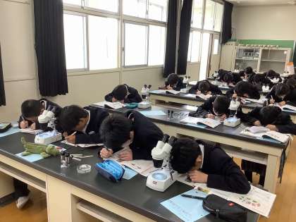 初めての理科室での授業では、ルーペや双眼実体顕微鏡の使い方を学び、タンポポの花のスケッチをしました。みんなルーペで花をみて、しっかりとスケッチすることができました。