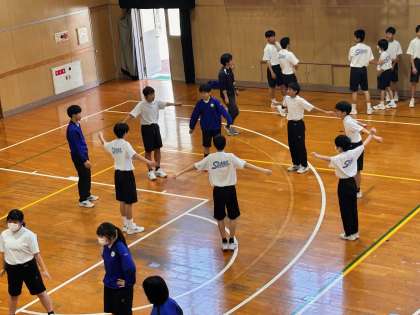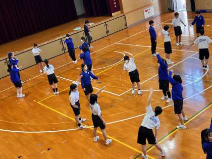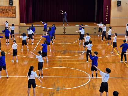 号令に合わせて指先、腕、脚、全身の曲げ伸ばしなど部分的な動きを意識しながら行っています。後半はグループに分かれて練習しています。