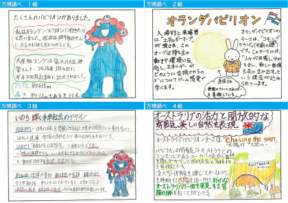授業で発表してくれた『万博調べ』で、特によかったものをクラスに1つずつ選び、廊下に掲示しました!