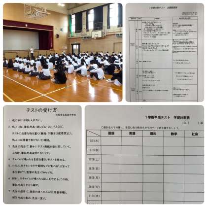 5月15日(木)6限、1年生は中学校で初めてのテストに向けて、テストの受け方について、体育館で諸注意を受けました。