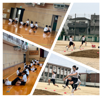 2年生体育の様子です。男子は運動能力テストの種目にある「上体起こし」、女子は走り幅跳びを行っています。男女どちらも自己記録の更新にチャレンジしています。