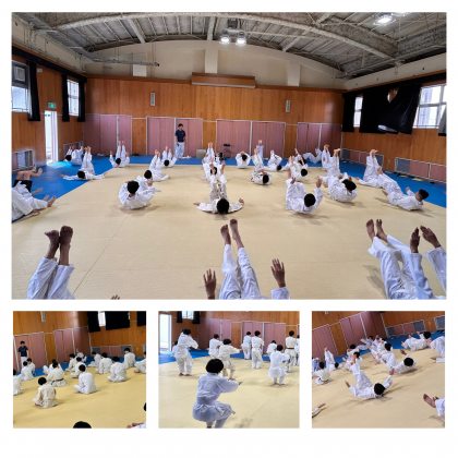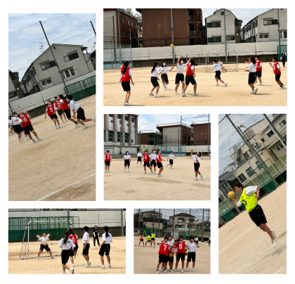 体育の様子です。男子は柔道、女子はハンドボールをしています。柔道の受け身は頭を打たないようにしっかりと両腕を畳に叩きつけて受け身を取っています。ハンドボールは前半にシュート練習、後半には試合を行っています。