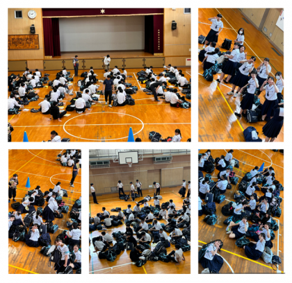 5時間目、3年生は体育館で修学旅行の荷物点検を行っています。各自必要な物はそろっていますか?不必要な物は入っていませんか? 準備と確認をしっかりやって、楽しい旅にしましょう。あとは日曜日の出発に備えて明日の過ごし方にも気をつけましょう。