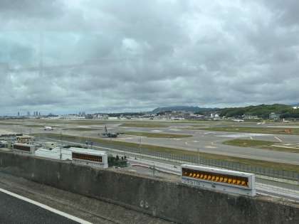 福岡都市高速道路を北上中。右手に福岡空港が見えます。