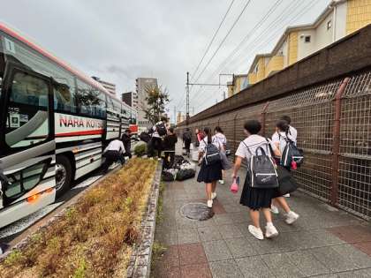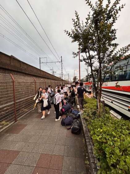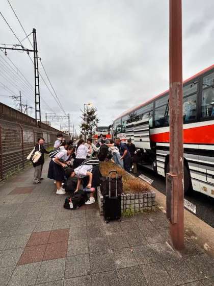 バスから荷物を出して学校まで移動です。1.2年生の先生方も迎えに来てくれていました。