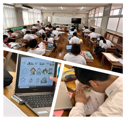 社会と美術の様子です。社会では歴史の古墳時代の学習、美術では防災ポスター作りを行っています。