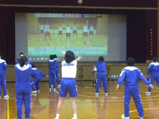 底冷えのする体育館と格技室です。1年生では、1組男女がダンス、2組男女が柔道の授業をしています。