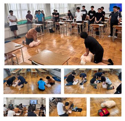 いざという時の人命救助。心肺蘇生やAEDの使い方などについて模型を使って実践しながら受講しています。心肺蘇生(心臓マッサージ)は肘をしっかり伸ばして一定のリズムで胸骨を圧迫しますが、これが結構体力を使うことがわかりました。