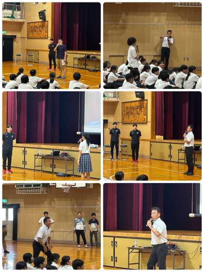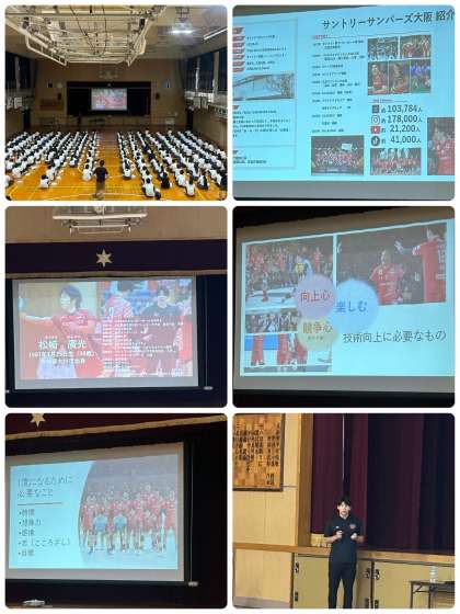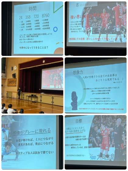 西成区キャリア教育推進支援事業で、1、2年生を対象にサントリーサンバーズ大阪U15監督の松崎 廣光様、サントリーサンバーズ大阪アシスタントコーチの松永 理生様をお招きし、どうすれば一流選手になることができるのかについて、ご講演いただきました。