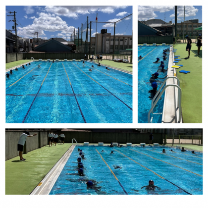 1年生の水泳の授業では、平泳ぎを行っています。平泳ぎは脚の使い方が難しく、「あおり脚」にならないようにキックする練習をしています。