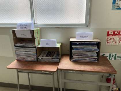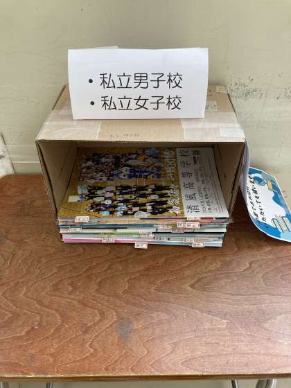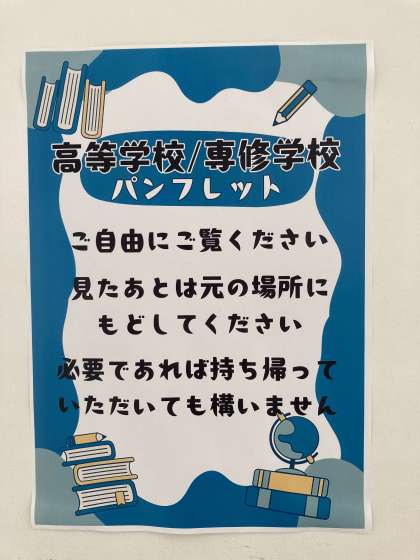 3年生の廊下に高校パンフレットを設置しています。進路選択の参考に、自由に手に取ってご覧ください。気になる学校を見つけるきっかけにしましょう。