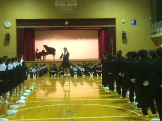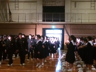 全生徒が一同に集まるのは、今日が最後となりました。生徒会主催で3年生を送る会を実施し、生徒会長の「贈る言葉」の後、在校生が「Believe」を合唱と手作りの花を贈呈しました。