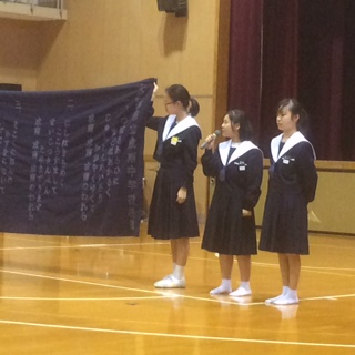 みなさんに見てもらっているのは昨年文化祭で展示した校歌の刺し子です。普段は個人が材料を持ってきて活動をしています。是非、一緒に活動しましょう。