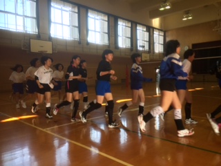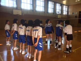 体育館では、バレーボール部が練習しています。さっと椅子を出してくれて、気配りのできる皆さんです。先輩の指示が的確で素晴らしかったですね。