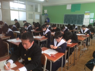 3年生になって初めてのテストです。1時間目の国語の授業に取り組む準備をする3年2組の生徒たちです。少し緊張した面持ちですが、登校時に「テスト頑張ってね」と声をかけると、にこやかに「はい!」と答える3年生です。