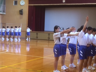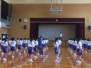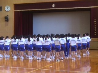 4時間目の体育の授業です。「2組男子集合!」「おう!」という大きな声をあげて機敏に動く子どもたちです。号令をかける体育委員の声はテンポがよく、大きな声で気持ちいいです。先生の指示や指導を聞いて、「右向け右、左向け左」の方向転換の仕方を学んでいます。かかととつま先を利用して90度向きをかけるのって、結構難しいですね。がんばっている1年生です。