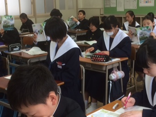 社会の授業です。地球儀であらわされた土地を紙面でどのように表現できるのだろうか。地図のお勉強です。1年生は真新しいノートにカラーペンを使って色分けしながら、丁寧に板書を写しています。どのノートもきちんとしていますよ。
