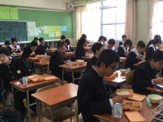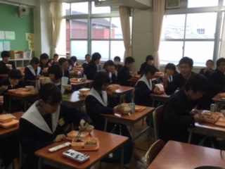 3年1組と2組の昼食タイムにお邪魔しました。修学旅行で流すBGMを聞きながら、しっかり噛んでエネルギーになる栄養をとっています。