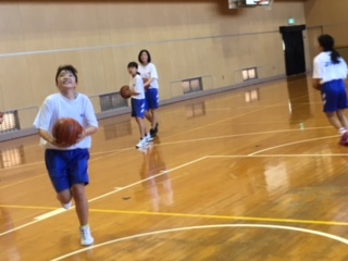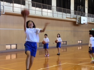 早朝から1年生の練習です。「・・・イチ、ニイ」と大きな声を出してレイアップシュートの練習です。ボール保持の位置を何度も確認しながら、力強いシュートが放てるようにしています。頑張れ〜。