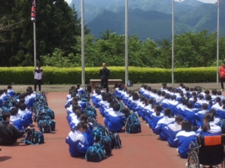 みんなを迎えてくれたのか、晴天で山の新緑が鮮やかに見えています。生徒の代表もしっかりと挨拶してくれました。