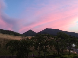 肌寒い中での飯ごう炊さんも終わり、風呂に入ってほっこり。高原も夕暮れで美しいです。もう後数分で日は落ちて真っ暗になります。