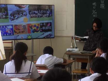 担任の先生の書画カメラのデビューです。今年の卒業アルバムを持って来て、運動会の様子を見せています。