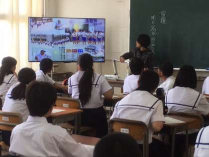 学級旗のデザインを見せていると「去年の見せて欲しい」という声が上がり、急遽、校長先生が携帯に撮りためた写真の学級旗を見てもらうことに。書画カメラって便利ですね。